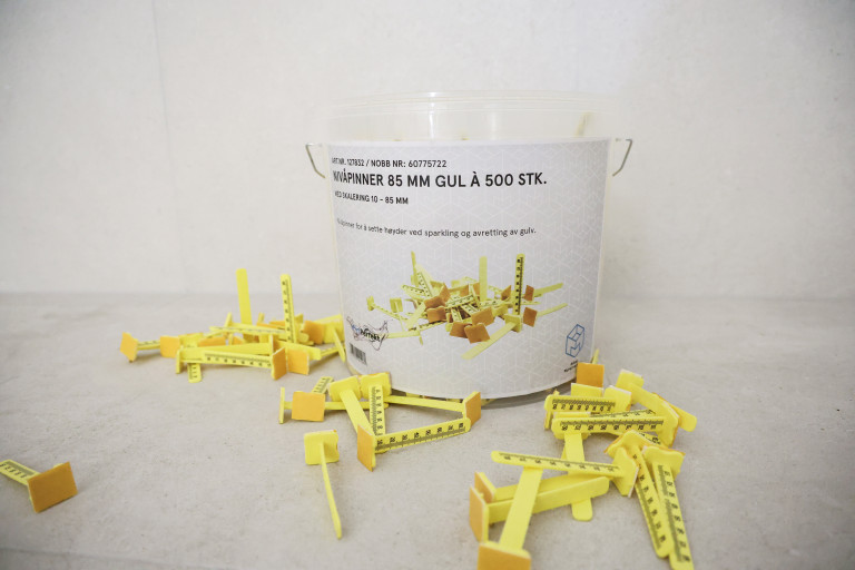 Nivåpinner 85 mm gul à 500 stk. med skalering 10 mm - 85 mm i målebøtte