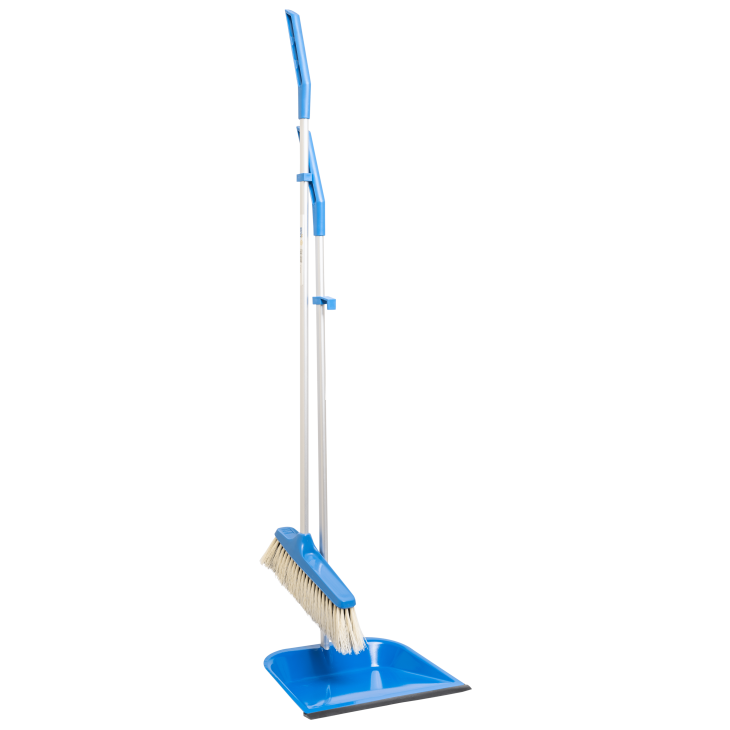 Feiesett med skaft og brett i metall. Brettet er utstyrt med gummilist som gir god kontakt med underlaget og enkel oppsamling. Skaftet henges enkelt opp på brettet.