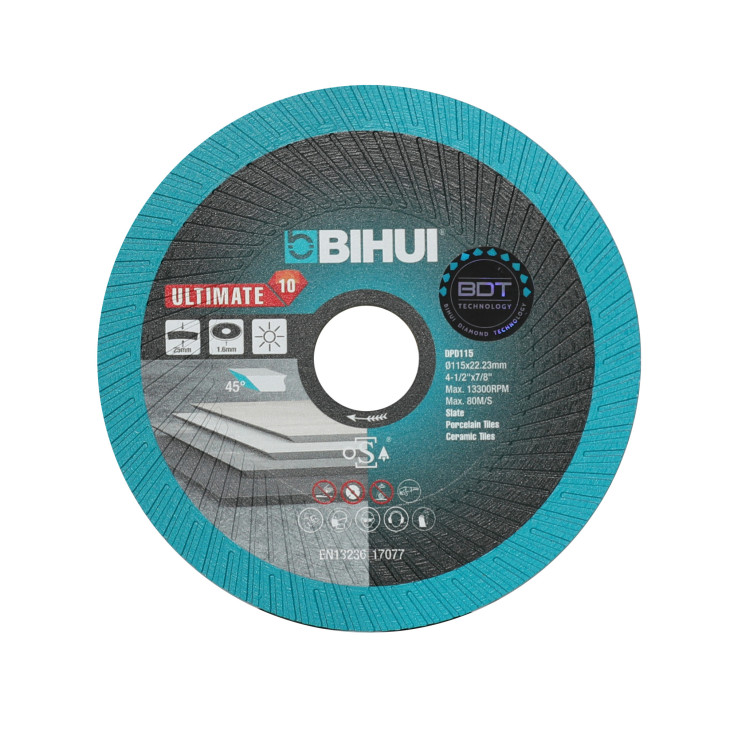 Bihui Diamantblad Ultimate Ø 115 mm/22,2 mm DPD115 er det ideelle valget for presis kutting, jolling (45 grader) og både tørr- og våtkapping av harde materialer som fliser, granitt og stein.