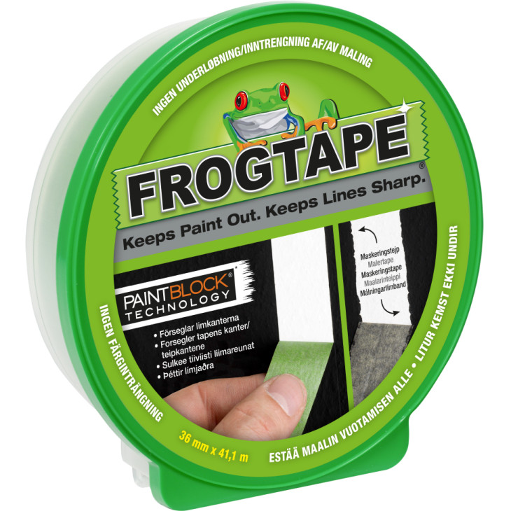 Med FrogTape® Multi-Surface kan du gi ditt neste prosjekt en touch av presisjon. Denne høykvalitets malertapen med innovativ PaintBlock®-teknologi garanterer superskarpe malingskanter ved å forsegle kantene på tapen og forhindre at malingen blør. Den utmerkede klebestyrken gjør denne malertapen ideell for ulike overflater og bruksområder. Takket være det løsemiddelfrie høytytende limet fester den seg raskt til underlaget, noe som eliminerer irriterende ventetid før maling. Gjør prosjektet ditt perfekt med FrogTape® Multi-Surface!