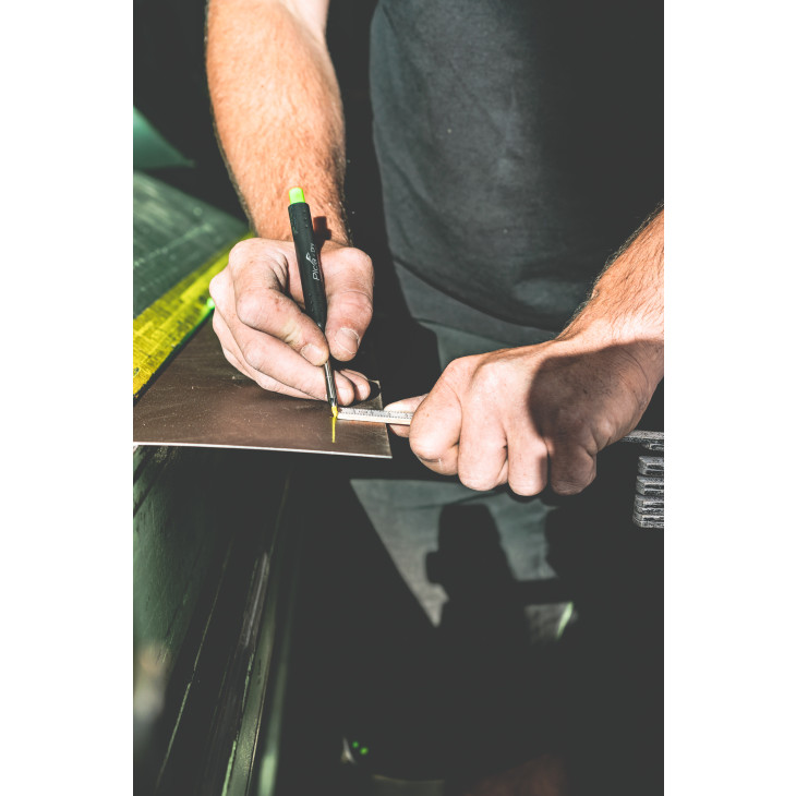 Denne merkepennen fungerer på alle materialer og overflater, inkludert støvete, grove, oljete, våte og mørke overflater, og er i tillegg enkele å fjerne fra overflaten igjen.