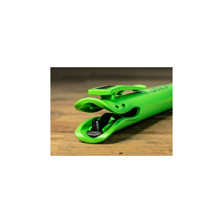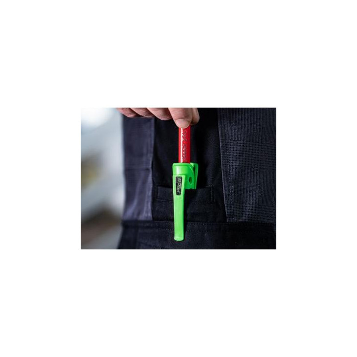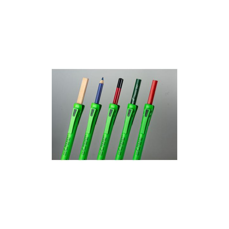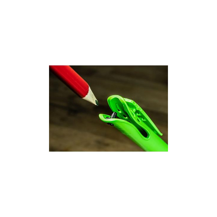 Praktisk holder for alle tykke treblyanter, som tømmermannsblyant og murerblyant. Den har en integrert kniv, av rustfritt stål, som gjør blyantkvessingen enkel og rask. Den innebygde holdemekanismen sørger for at blyanten alltid er tilgjengelig, selv om det bare er en liten stump igjen av den.