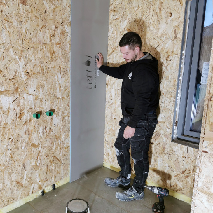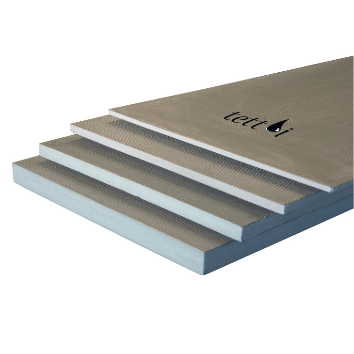 Tetti Våtromsplate 12mm, 60x244cm er en diffusjonsåpen membranplate, med en vanntett XPS kjerne som er dekket av glassfiberarmert mørtel på begge sider.