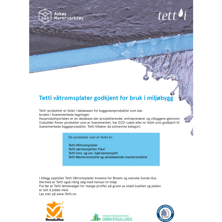 Dette gir et perfekt underlag for flis eller tilsvarende kledning. Platene er vanntette, sopp- og råtesikre, og har en svært god isolerende effekt. Tetti Våtromsplater kan bruker på vegg, gulv, til innkledning og konstruksjon.